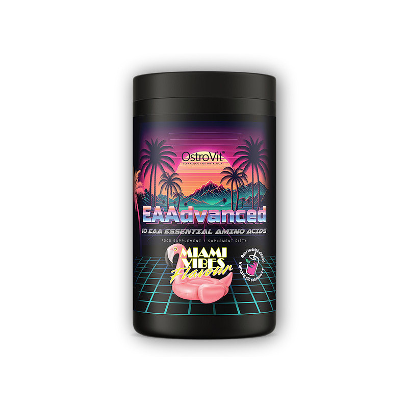 OstroVit EAAdvanced with Miami Vibes je vysoko kvalitný práškový doplnok stravy. Je to komplexná živina obsahujúca esenciálne aminokyseliny (EAA), aminokyseliny s rozvetveným reťazcom (BCAA) a cenné elektrolyty. Je to produkt vytvorený pre fyzicky aktívnych ľudí, ktorí majú zvýšené požiadavky na živiny obsiahnuté v produkte.
