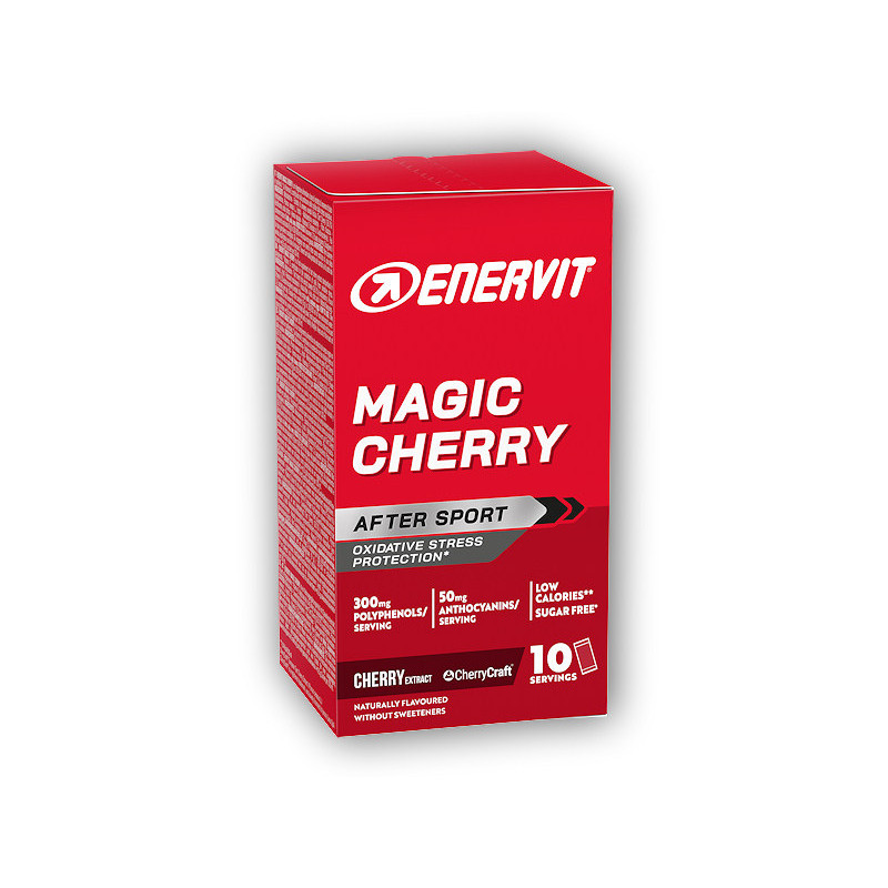 Enervit Magic Cherry je špeciálny extrakt z čerešní, ktorý obsahuje vysoké množstvo (300 mg na dávku) polyfenolov a vitamínu E s vysokou antioxidačnou silou. Tieto látky zohrávajú dôležitú úlohu pri podpore obranyschopnosti organizmu proti oxidačnému stresu a pôsobia proti voľným radikálom produkovaným pri intenzívnom fyzickom cvičení. To výrazne podporuje úplnú a efektívnu regeneráciu po vysoko intenzívnom vytrvalostnom výkone.